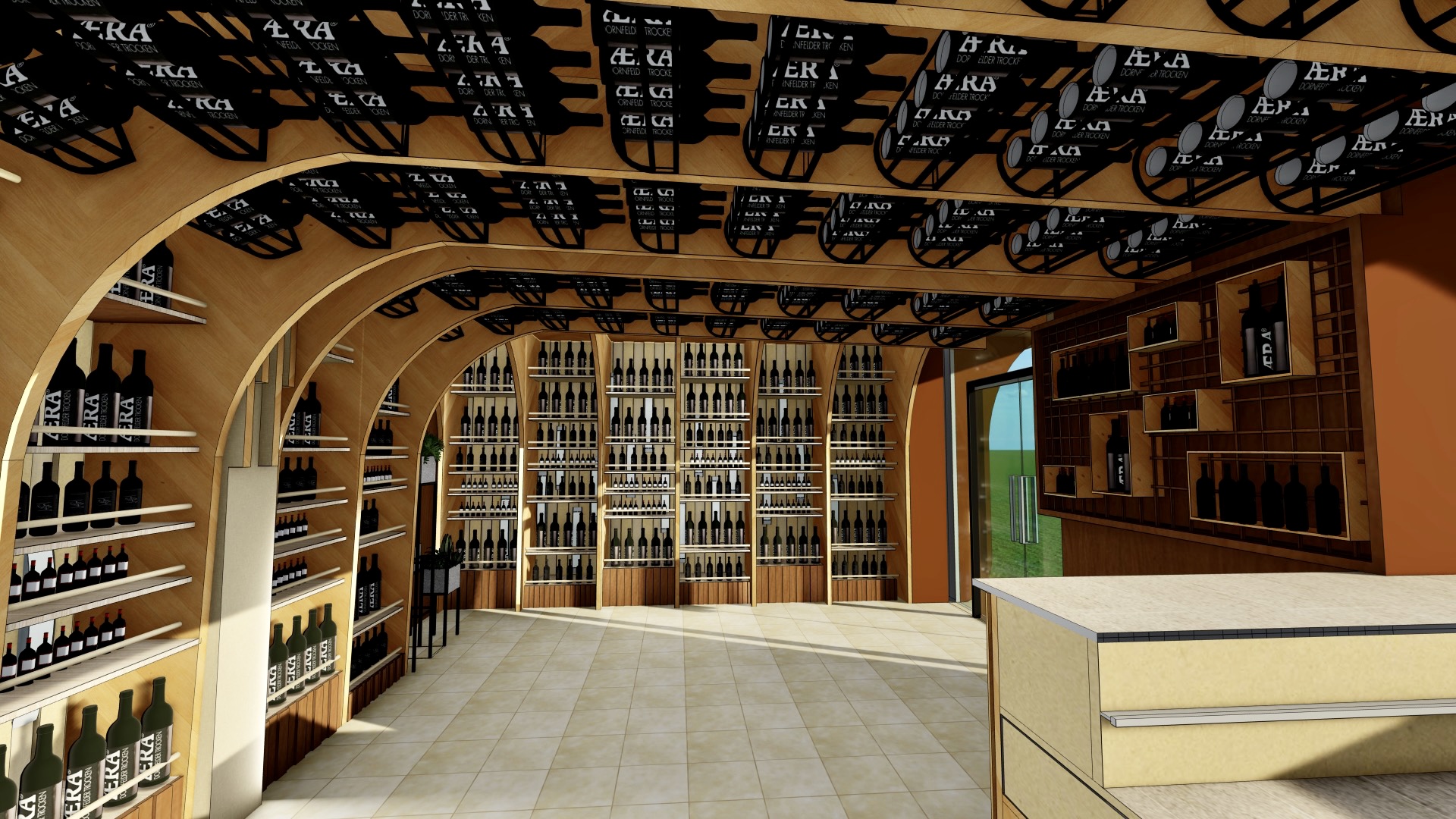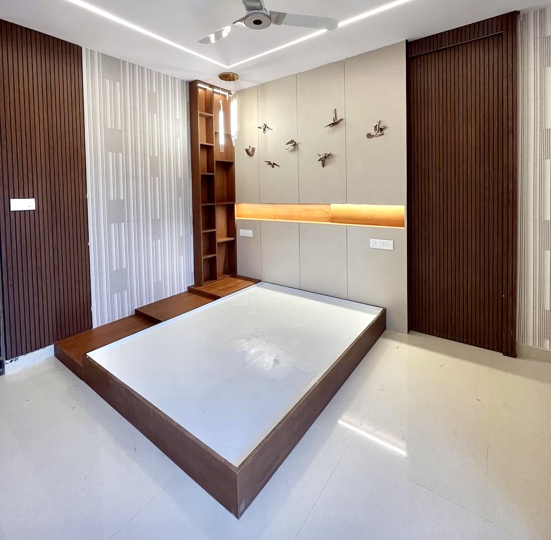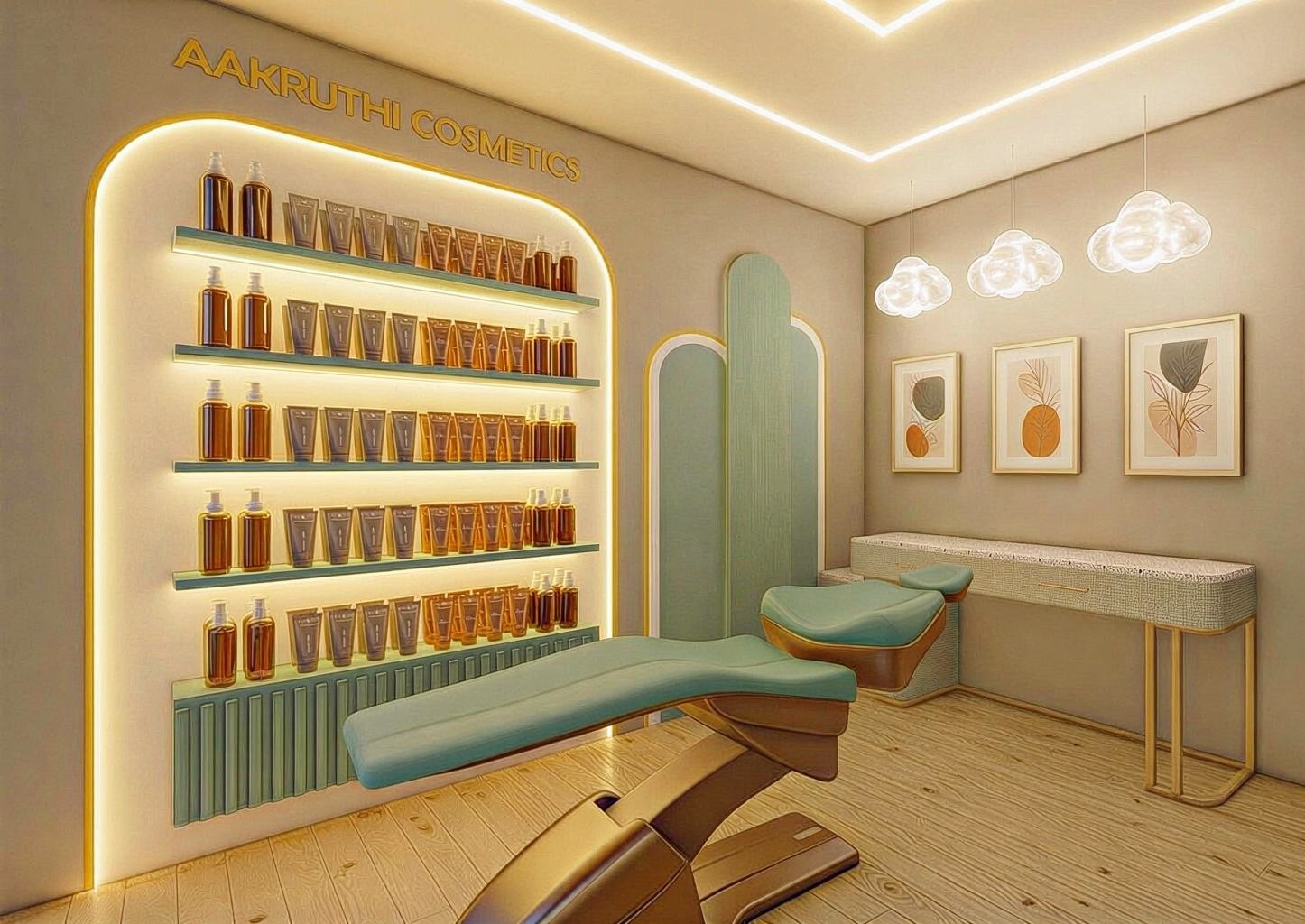The backdrop highlights a textured wooden slat wall, adding warmth and depth while enhancing acoustic comfort. A minimalist illuminated logo on the wall creates a strong brand presence, subtly glowing against the clean white curved architecture. The ceiling design incorporates soft cove lighting and contemporary ring pendant lights, delivering layered illumination that feels both elegant and inviting.