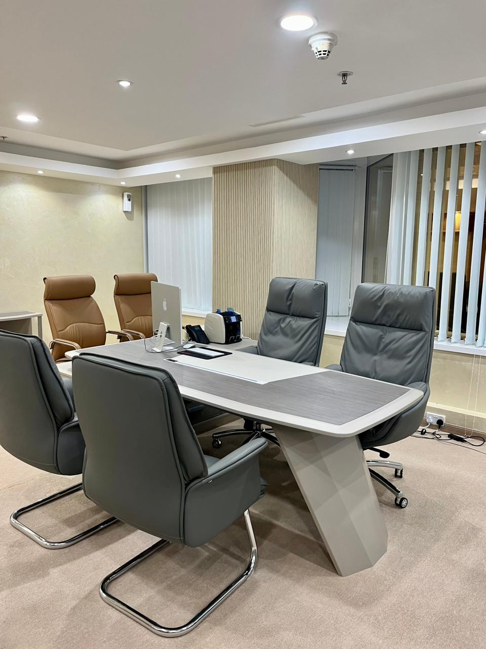 This office showcases a refined, modern interior designed to balance professionalism with comfort. The space features a sleek conference table with a matte finish and wood accents, surrounded by ergonomic black leather chairs that offer both style and support for productive meetings.